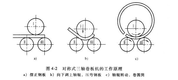 該機(jī)結(jié)構(gòu)型式為三輥對稱式,上輥在兩下輥中間對稱位置作垂直升降運(yùn)動,通過絲桿絲母蝸桿傳動而獲得,兩下輥?zhàn)餍D(zhuǎn)運(yùn)動,通過減速機(jī)的輸出齒輪與下輥齒輪嚙合,為卷制板材提供扭矩。